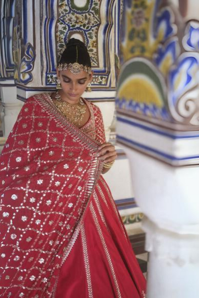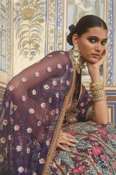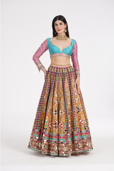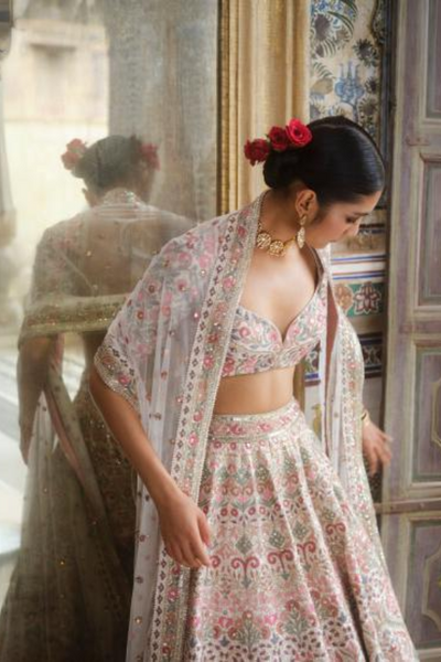 Trance Print Dupion Silk Embroidered Bustier With Embroidered Frill Hem Lehenga And A Peach Mukaish Net Dupatta With Tassels