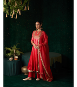 A vibrant red straight Anarkali with keyhole neckline, featuring a beautifully crafted Ikkat yoke elevated with intricate Gota, Threads, Aari and Mirror work. The flat silk Palazzo adds graceful volume...