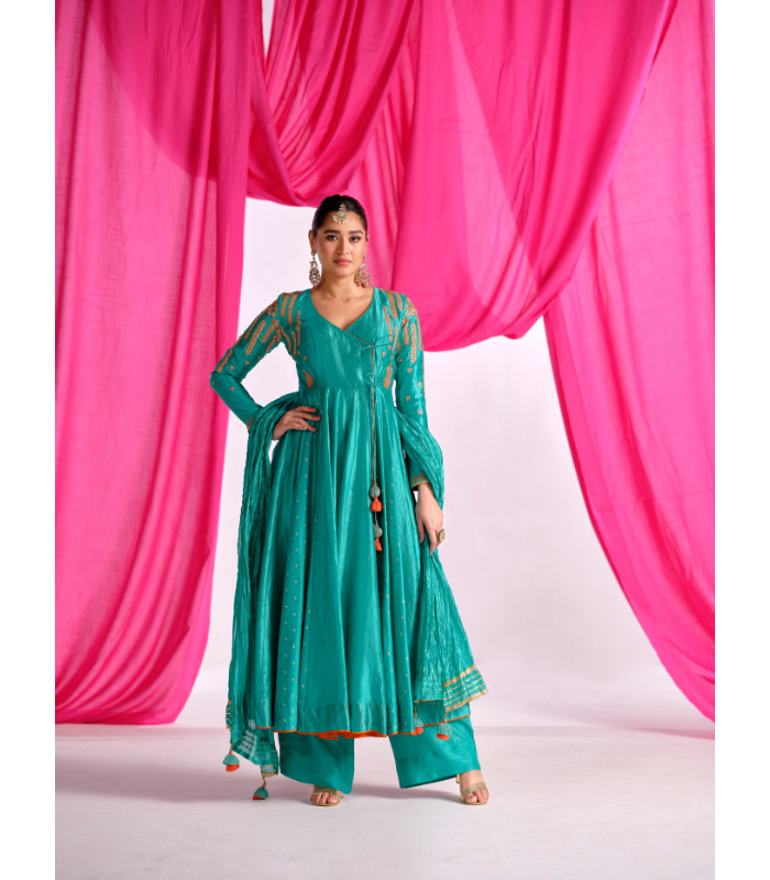 This graceful outfit pairs a silk fabric top with a flat silk bottom and an organza dupatta. The intricate Gota, thread, and Aari work on the top and dupatta elevate...