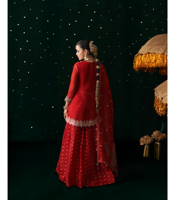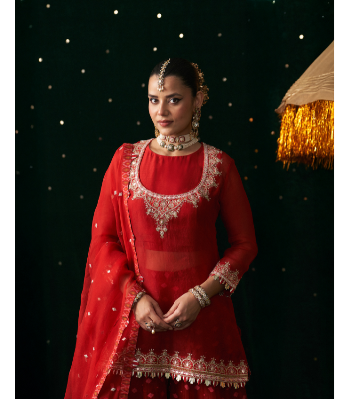 This look features a Red short kurta paired with a voluminous sharara in brocade silk. The kurta is accentuated with Gota, Aari and Pearl embroidery along the neckline, hem, and sleeves. The sharara is crafted in self-patterned brocade silk, creating a harmonious blend of texture and shine. Completing the look is a sheer red dupatta adorned with delicate buta embroidery, handmade border and tassels.