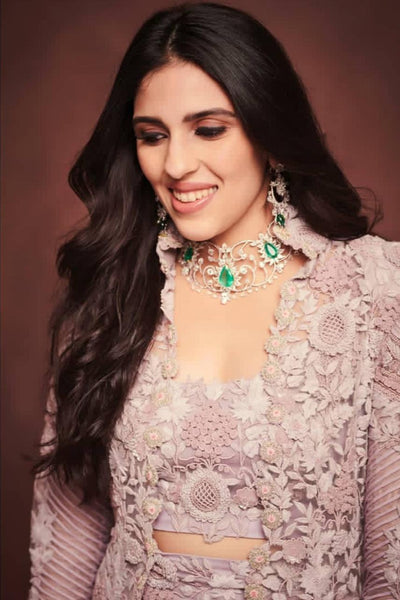 Shloka Ambani in a lilac color ensemble that comprised of a crop top , lehenga skirt and a long jacket all in the same hue. both the crop top and...
