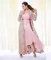 Sonakshi Sinha in Anamika Khanna's pastel pink skirt set which is teamed with an embellished jacket and a crop top. Work-Embellished intricate sequins work long jacket collar set with plain...