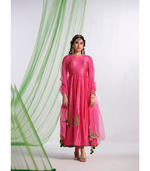 This look features a hot pink silk Anarkali that exudes youthful elegance. The silhouette is enhanced with a flattering V-neckline and intricately embellished front panel, detailed with zardozi work, sequins,...