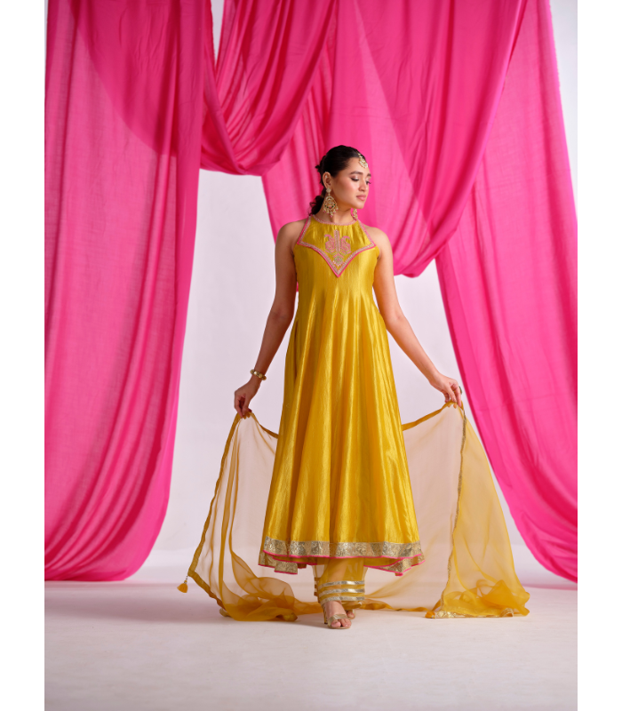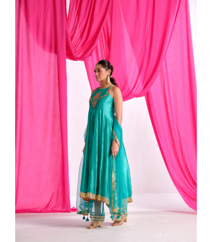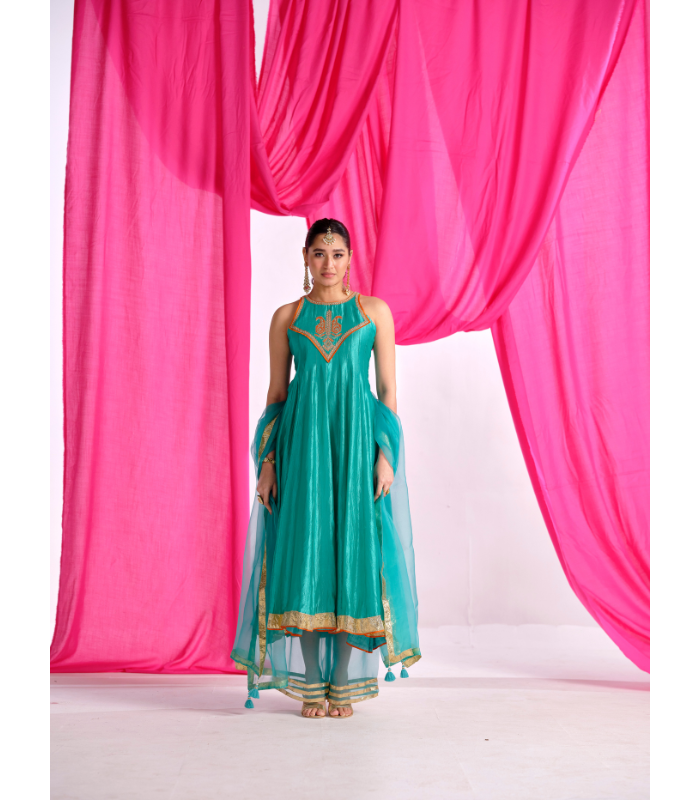 This set pairs a silk fabric top with a flat silk bottom and an organza dupatta. The intricate Gota, thread, and Aari work add a touch of opulence to the ensemble.