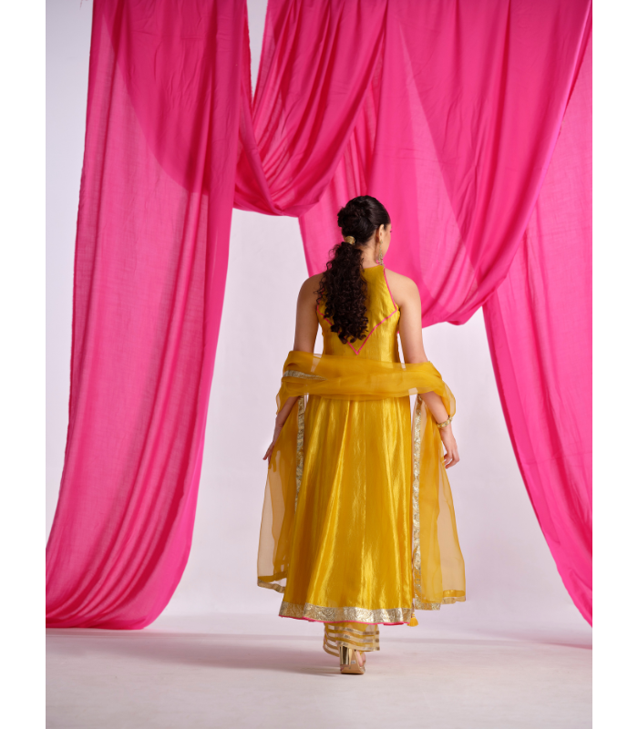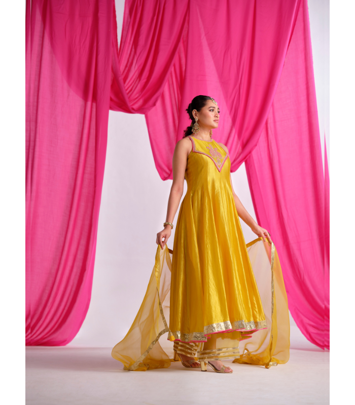 This set includes an Anarkali, palazzo, and dupatta in Beige Chanderi tissue with Gota work. The dupatta is finished with a lumpi border. Components: 3 Fabric:- Top: Chanderi Tissue - Bottom:...