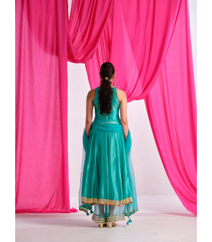 A stunning Royal blue Anarkali set in luxurious Chanderi silk, designed with a structured silhouette and detailed with delicate gota embellishments along the neckline, waist, and borders. The sleeveless kurta...