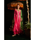 This look features a hot pink silk Anarkali that exudes youthful elegance. The silhouette is enhanced with a flattering V-neckline and intricately embellished front panel, detailed with zardozi work, sequins,...