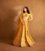 This lehenga set is ideal for a glamorous wedding ceremony, radiating elegance and grace. The marodi work makes it a statement piece, guaranteed to turn heads and leave a lasting impression.