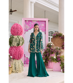 Printed Embellished Jacket Paired With Flared Pants Fabric : Printed Georgette, Habotai Silk, Satin LiningEmbroidery : Hand workColor : Emerald GreenNo. Of Components : 2Care : Dry Clean OnlyDelivery Time...