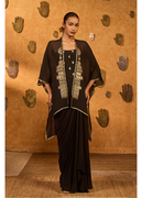 Details: An edgy yet elegant black organza oversized cape, adorned with intricate hand embroidery at the front and framed by a foil-printed border all around. Beneath, the set offers a...