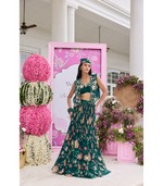 Payal Singhal Dusky pink velvet embroidered sleeveless top worn with forest green velvet embroidered lehenga and belt