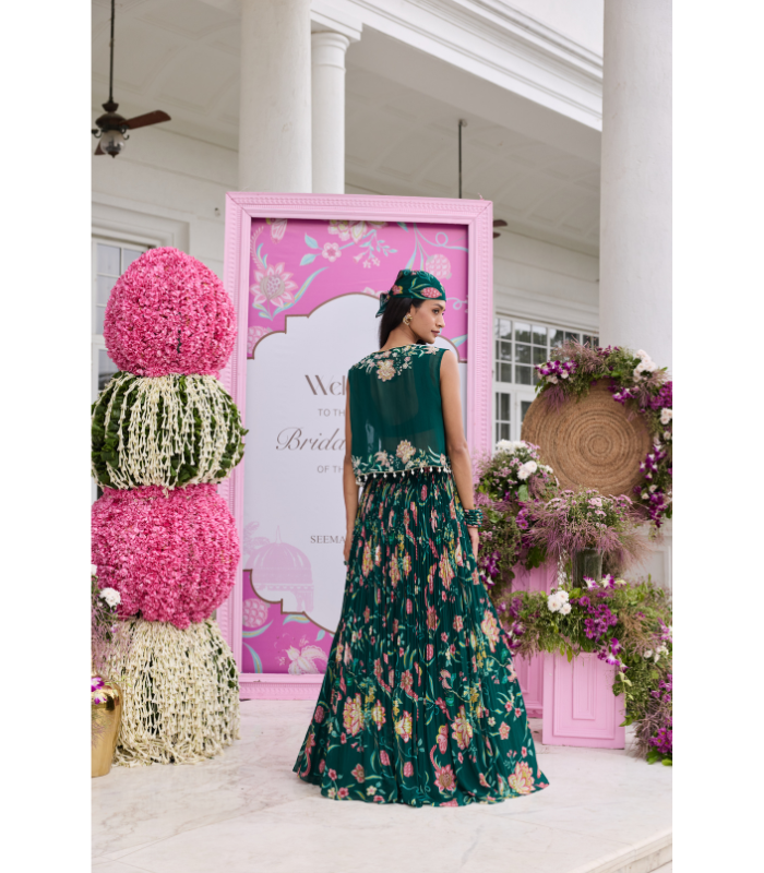 Embellished Choli Paired With An Embellished Jacket And Printed Skirt With Can Can