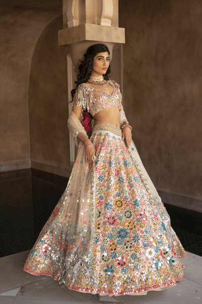 Multicoloured floral pattern lehenga WORK-Skirt - mirror, resham , moti, sequence. Blouse - fringes, mirror, resham & sequence work Dupatta - fringes, mirror, resham & sequence work DELIVERY TIMELINE -Delivery...