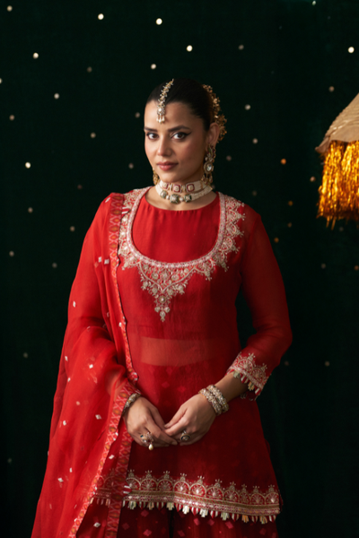 Coral Embroidered Top With Coral And Pink Ombre Shaded Gathered Skirt And Coral Mukaish Net Dupatta.