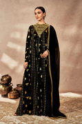 Details: An edgy yet elegant black organza oversized cape, adorned with intricate hand embroidery at the front and framed by a foil-printed border all around. Beneath, the set offers a...