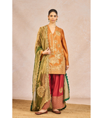 Details: Kurta- Mithi Makaai and Kashmiri Kali embroidered motif | Full sleeves | Tissue patchwork | Zero neckline | Side zipper | Bottom- Asymmetric hemline | Olive gul rang print | Ornate border |Side zipper| Lined | Dupatta- Paankh bagh motif| Paankh shaped hem | Ornate border
