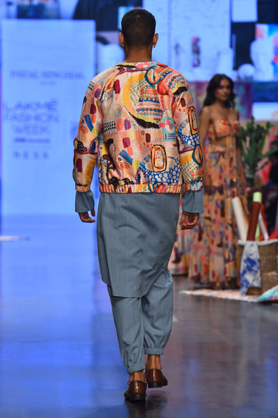Trance Print Dupion Silk Bomber Jacket With Denim Kurta And Jogger Pants