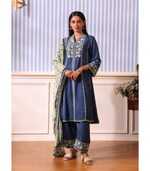 The matching pants carry the same soft pink palette, enhanced with embroidered detailing at the hem. Completing the ensemble is a statement dupatta— adorned with a harmonious blend of delicate embroidery. Soft, serene, and striking in its simplicity—this set is your go-to for understated celebrations and refined everyday wear.