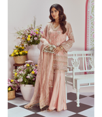 Drenched in elegance and old-world charm, this blush pink and soft green set is a graceful pick for intimate wedding functions or a dreamy daytime soiree. The kurta features exquisite pastel threadwork in floral motifs, accented with delicate lace trims and scalloped detailing that exude soft femininity and intricate craftsmanship. The broad trousers are adorned with fine jaali embroidery and broad lace hems that complement the kurta beautifully while adding a touch of royalty. Paired with a dupatta in a matching pastel palette, finished with statement scalloped edges, the entire ensemble captures a poetic blend of sophistication and serenity.