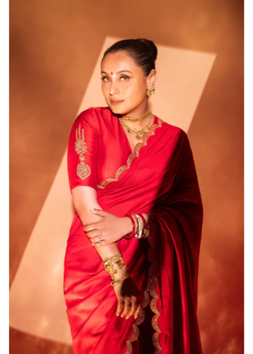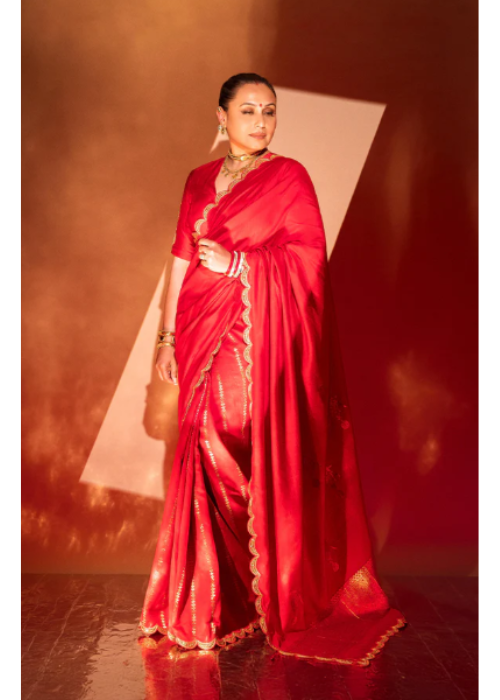 Details: Crafted in a deep festive red, this saree is woven in rich jacquard silk fabric, exuding opulence with every fold. A delicate scallop lace borders the edges, adding a soft, feminine finish to the structured weave. The look is paired with a spun silk blouse featuring a striking gold foil motif at the center, bringing focus to the design. With elegant elbow length sleeves, the blouse perfectly complements the ornate aesthetic of the saree, making it ideal for celebratory occasions.