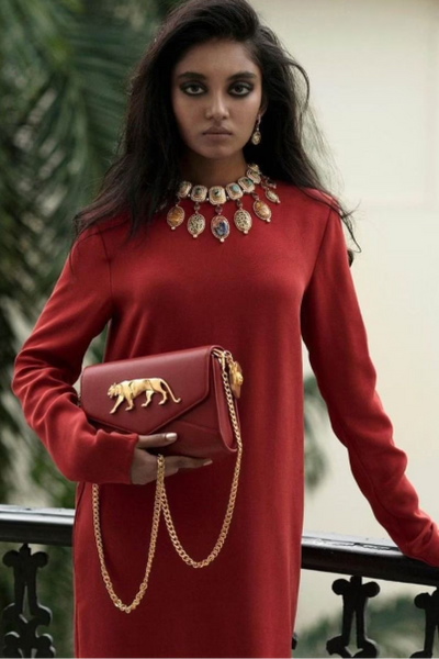 DESCRIPTION-Sabyasachi Rouge Calcutta Sling Bag FABRIC COMPOSITION-Rouge flap bag with gold-tone Royal Bengal Tiger carved brand logo & metal chain sling detail. DELIVERY TIMELINE-READY TO SHIP CARE INSTRUCTION-Store in dust...