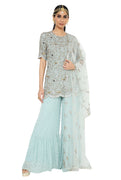 Off White Georgette Embroidered Kurta With Back Cut Out And Abla Silk Sharara And Net Mukaish Dupatta