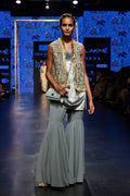 Payal Singhal Stone color Crepe Bustier and Sharara Pants worn with Georgette Tulip garden Embroidered One-Sided Jacket and Gold color Lace Belt