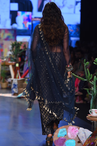 Navy Organza Embroidered Yoke Anarkali With Dash Ikat Banarasi Georgette Palazzo And Mukaish Net Dupatta