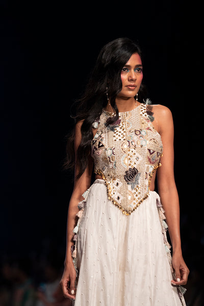 Off White Georgette Embroidered Kurta With Back Cut Out And Abla Silk Sharara And Net Mukaish Dupatta