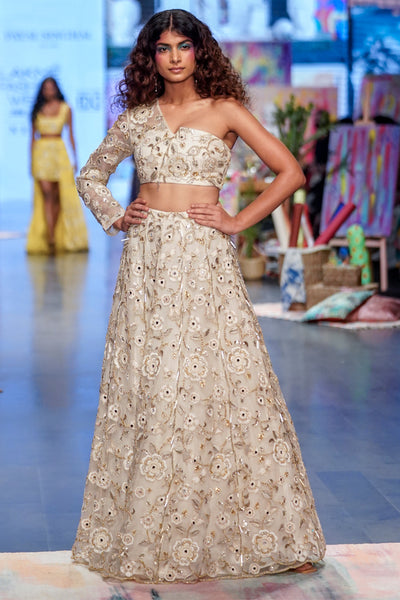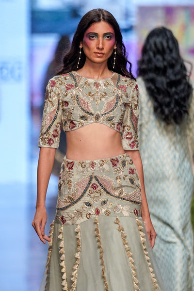 Powder Blue Velvet Embroidered Choli With A Velvet Basque Organza Skirt And Mukaish Net Dupatta