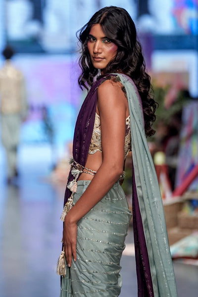 Off White Georgette Embroidered Choli With Powder Blue And Purple Georgette Sequins Saree
