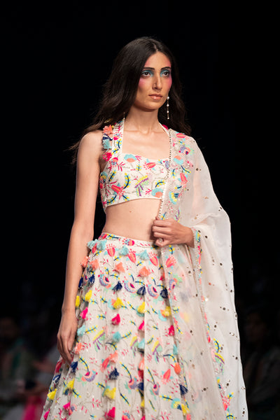 Trance Print Dupion Silk Embroidered Bustier With Embroidered Frill Hem Lehenga And A Peach Mukaish Net Dupatta With Tassels