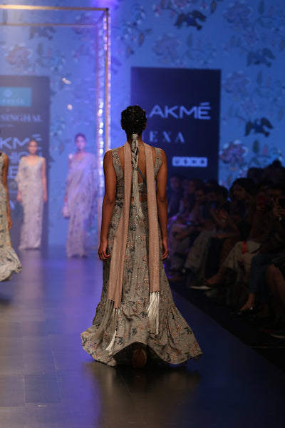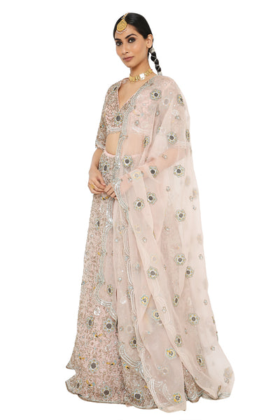 Powder Blue Velvet Embroidered Choli With A Velvet Basque Organza Skirt And Mukaish Net Dupatta