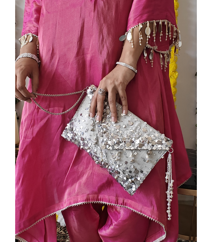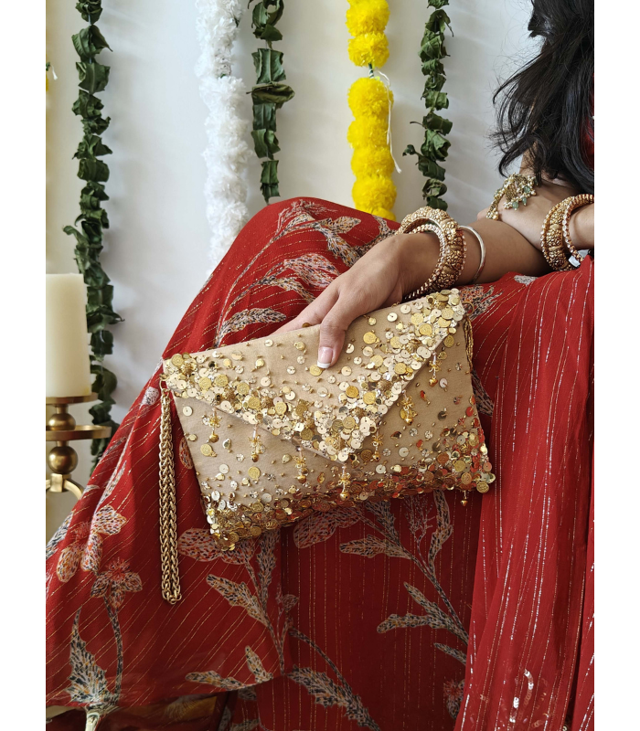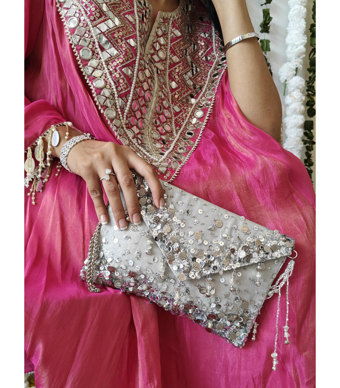 Consider this your modern-day shagun envelope — except she’s far too pretty to be handed over and forgotten. Sleek, sparkly and unapologetically statement, the Lifafa Bag is designed to slip right under your arm or dangle off your wrist with that chunky chain handle.