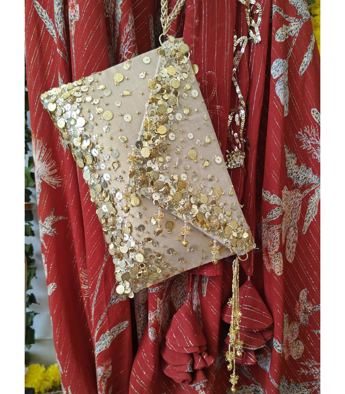 Add that perfect pop of sparkle to your festive wardrobe with the Mirror Potli Bag!It’s not just a bag, it’s the ultimate festive accessory, combining shimmer, tassels, and a whole...