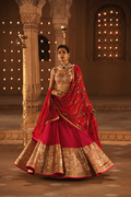 This exquisite Lehenga Suit set has all over heavy Aaree work which is further enahnced by thread work and Katdana work. The top in addition has heavy swarovski surface work...