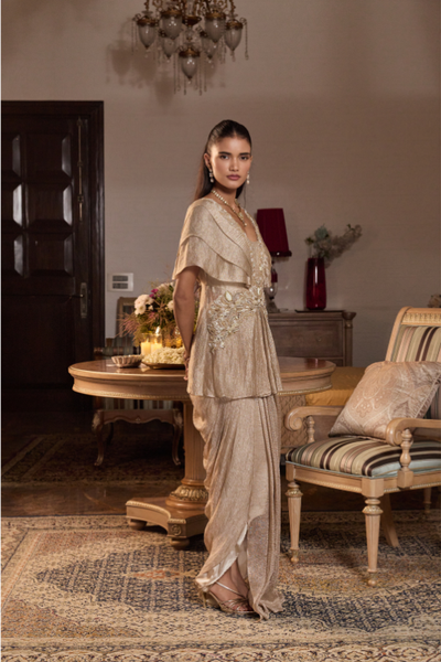 Embellished Peplum Top Paired With Draped Skirt Fabric : Tissue, Satin LiningEmbroidery : Hand workColor : Tissue GoldNo. Of Components : 2Care : Dry Clean OnlyDelivery Time : 5/6 weeks