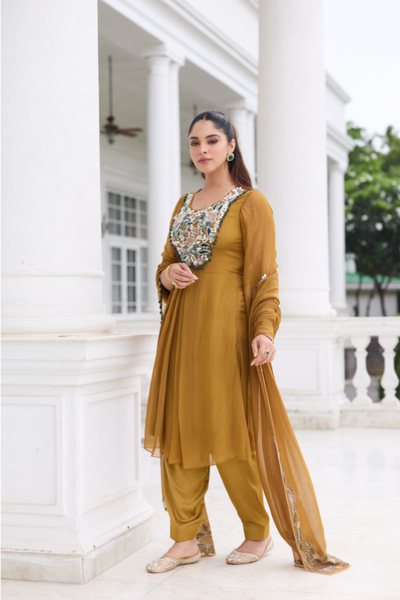 Embellished Kurta Paired With Salwar And Dupatta Fabric : Organza, Satin, Satin LiningEmbroidery : Hand work & Machine workColor : Brass GoldNo. Of Components : 3Care : Dry Clean OnlyDelivery...