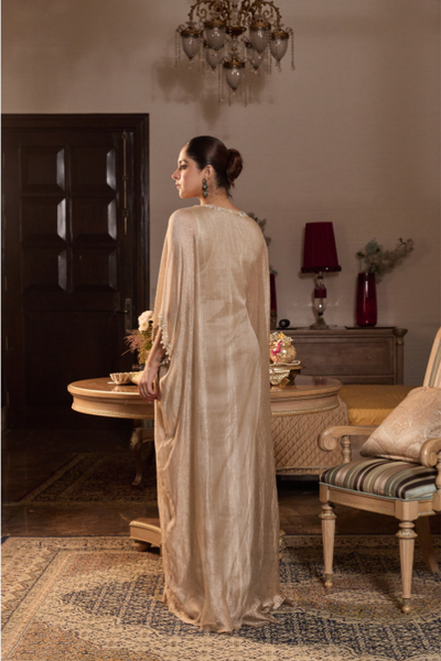 Embellished Draped Full Length KaftanFabric : Tissue, Satin LiningEmbroidery : Hand workColor : Tissue GoldNo. Of Components : 1Care : Dry Clean OnlyDelivery Time : 2-3 week