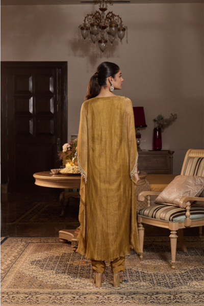Embellished Kaftan Paired With Pants Fabric : Tissue, Habutai Silk, Satin LiningEmbroidery : Hand workColor : Tissue Dark GoldNo. Of Components : 2Care : Dry Clean OnlyDelivery Time : 25...