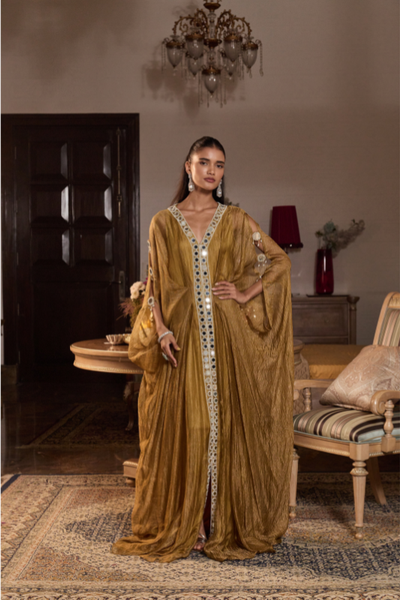 Embellished Draped Full Length Kaftan Fabric : Tissue, Satin LiningEmbroidery : Hand workColor : Tissue Dark GoldNo. Of Components : 1Care : Dry Clean OnlyDelivery Time : 3 weeks
