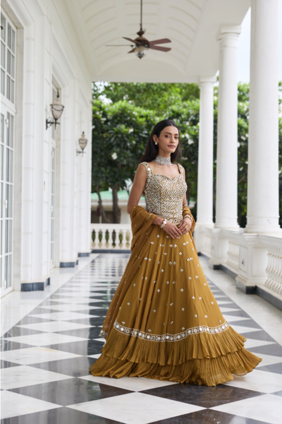 Embellished Choli Paired With An Embellished Lehenga With Can Can And Dupatta Fabric : Georgette, Organza, Satin LiningEmbroidery : Hand work & Machine workColor : Brass GoldNo. Of Components :...