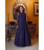Midnight blue gown with beautiful floral and geometrical artwork and work done with resham, Swarovski stone, cutdana, sequins Color: Midnight Blue Fabric: Silk Organza no of components - 1 Delivery Time: 3-4 weeks...