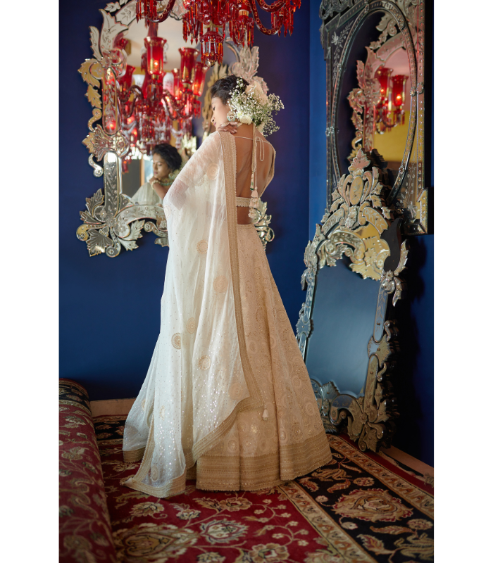 Lehenga work inspired by the mandala art for the artwork same as the brand logo with cord embroidery and sequins and Swarovski work to glitterise.