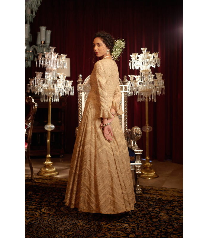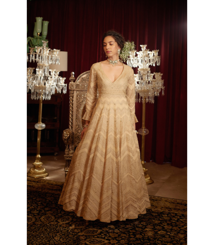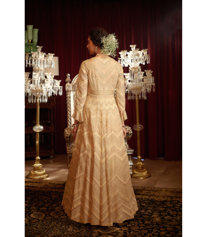 Chevron artwork gown with highlighting of gold work and lace patching detailing.