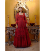 Red gown with maroon and red embroidery work and intricate artwork detailing with embroidered of cutdana, dabka, Swarovski stones, beads, sequins. Color: Scarlet Fabric: Silk Organza no of components - 2 Delivery...