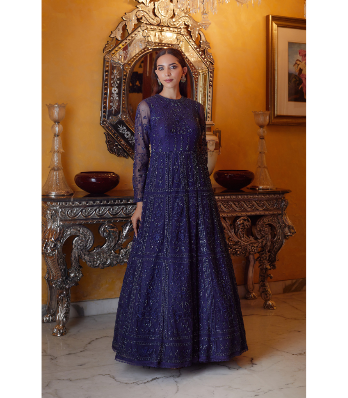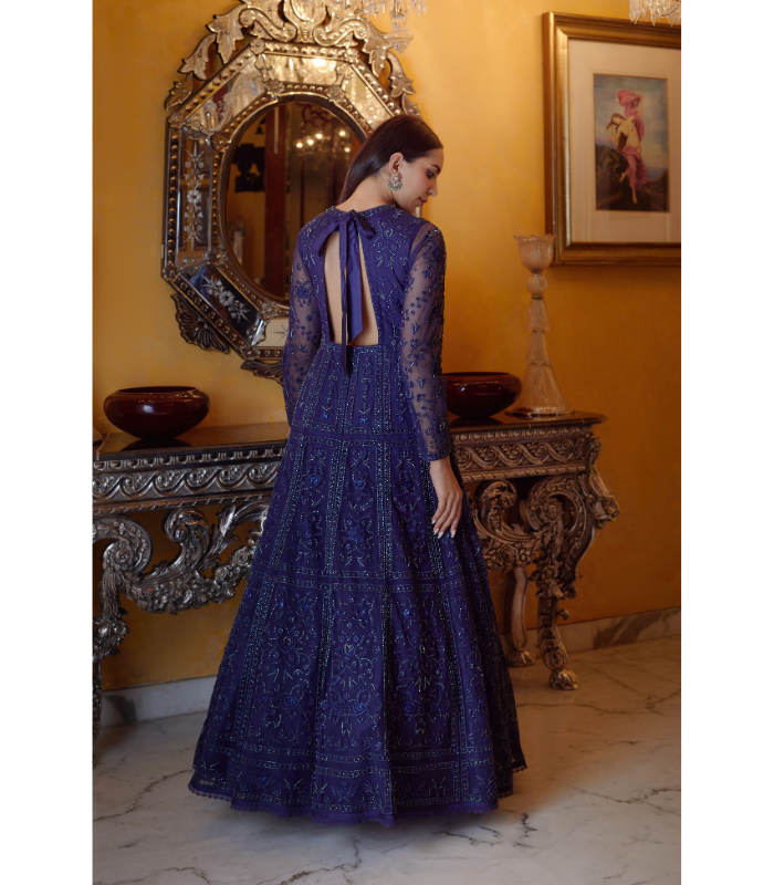 Midnight blue gown with beautiful floral and geometrical artwork and work done with resham, Swarovski stone, cutdana, sequins