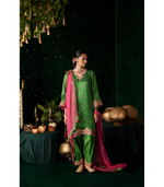 A vibrant celebration of traditional charm, this parrot green ensemble is crafted in luminous silk for a festive, radiant look. The straight kurta features delicate buti embroidery scattered across the...