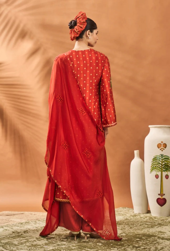 Details: Kurta- A-line tunic with all-over foil print | ‘V’ neckline and sleeve hems finished with appliqué foil print borders Pant- Paired with rust straight pants featuring foil-printed borders |...