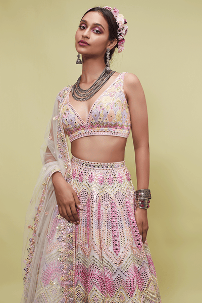 Light Blush Pink Mirror Resham Detailed Lehenga Set